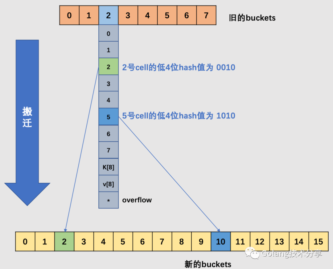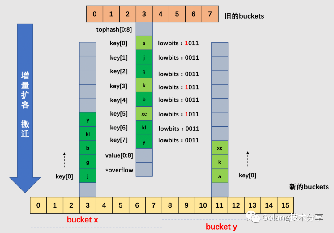 以3号bucket为例,可以看到,由于B值加1,所以在新选取桶时,需要取低4位哈希值,这样就会造成cell会被搬迁到新buckets数组中不同的桶(3号或11号桶)中去。注意,在一个桶中,搬迁cell的工作是有序的:它们是依序填进对应新桶的cell中去的。