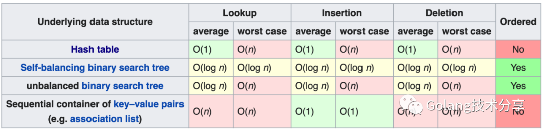 可以看到,对于元素查找而言,二叉搜索树的平均和最坏效率都是O(log n),哈希表实现的平均效率是O(1),但最坏情况下能达到O(n),不过如果哈希表设计优秀,最坏情况基本不会出现(所以,读者不想知道Go是如何设计的Map吗)。另外二叉搜索树返回的key是有序的,而哈希表则是乱序。