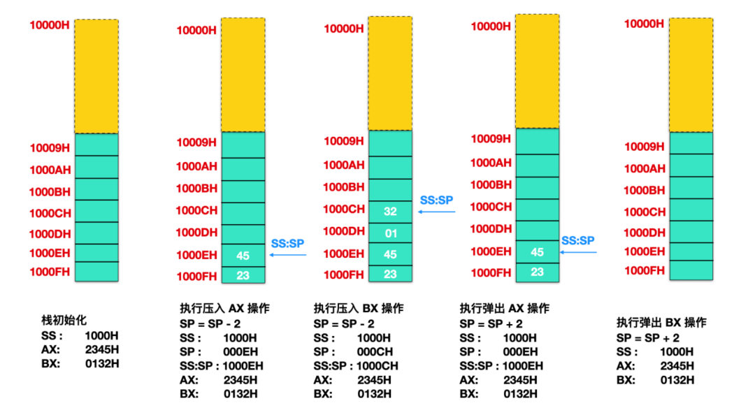 ❝这里注意一点:8086 CPU 中的入栈和出栈都是以字为单位进行的。