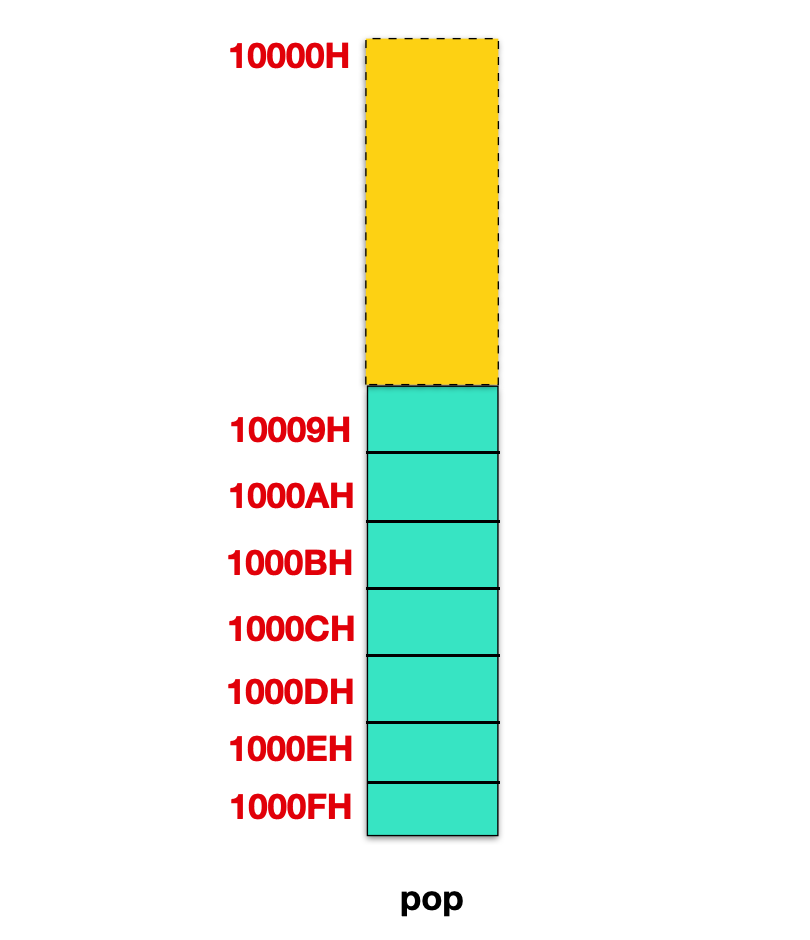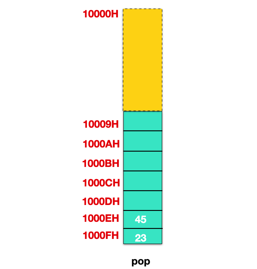 当使用 「POP」 指令从栈中弹出 2 个字节单元的字单元时, SP = SP + 2 ;即栈顶元素会发生变化;