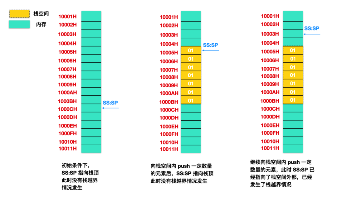 第一开始,SS:SP 寄存器指向了栈顶,然后向栈空间 push 一定数量的元素后,SS:SP 位于栈空间顶部,此时再向栈空间内部 push 元素,就会出现栈顶越界问题。