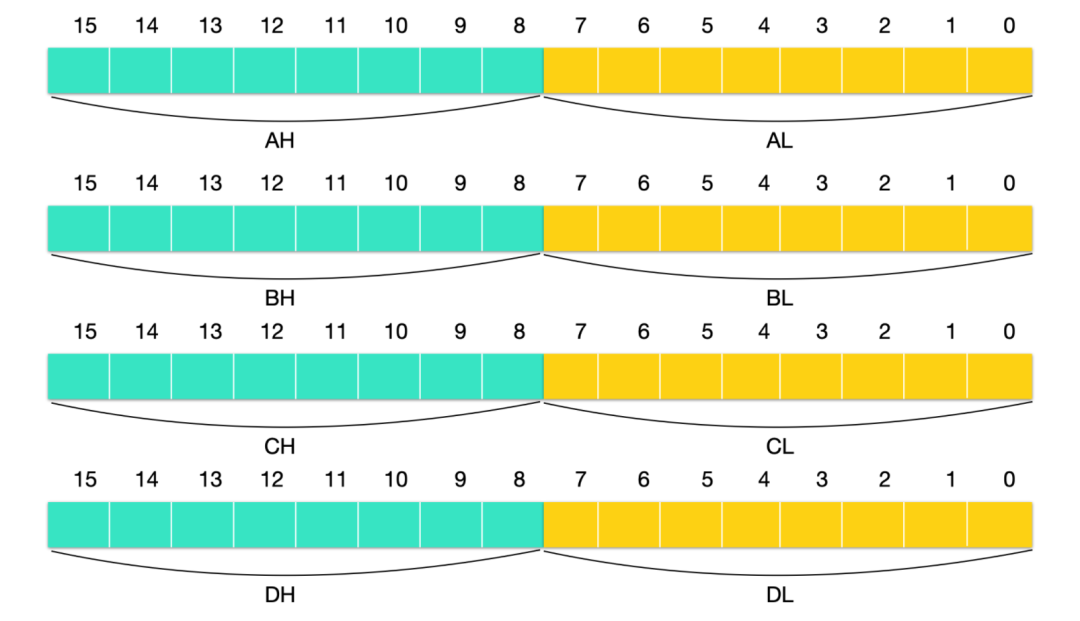 8086 CPU 的上一代寄存器是 8080 ,它是一类 8 位的 CPU,为了保证兼容性,8086 在 8080 上做了很小的修改,8086 中的通用寄存器 AX、BX、CX、DX 都可以独立使用两个 8 位寄存器来使用。