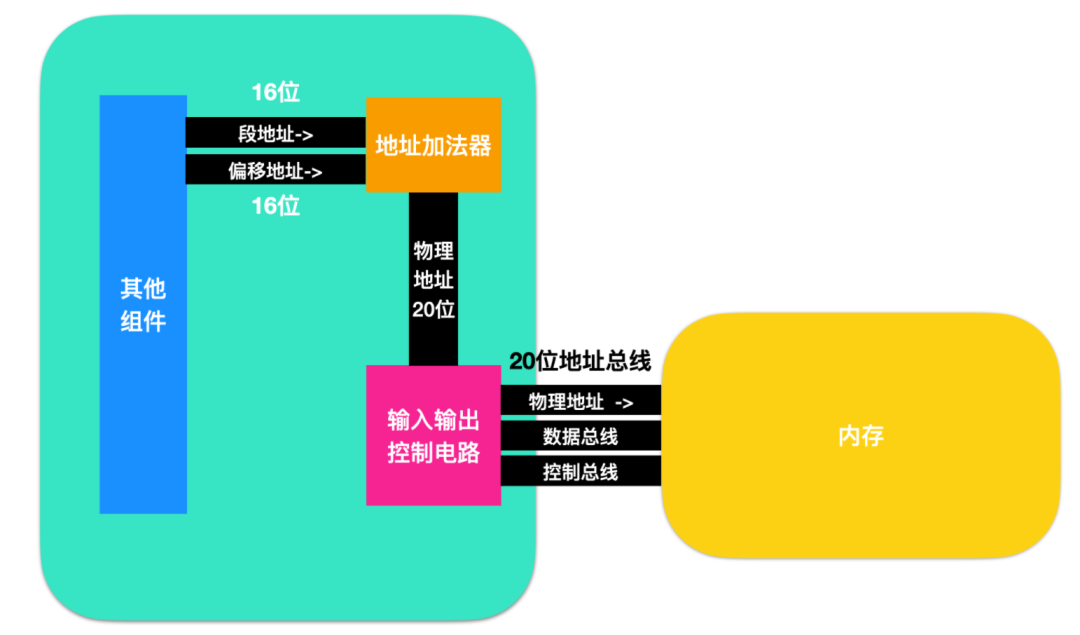 在 CPU 内部,由 CS、IP 提供段地址,由加法器负责转换为物理地址,输入输出控制电路负责输入/输出数据,指令缓冲器负责缓冲指令,指令执行器负责执行指令。在内存中有一段连续存储的区域,区域内部存储的是机器码、外面是地址和汇编指令。