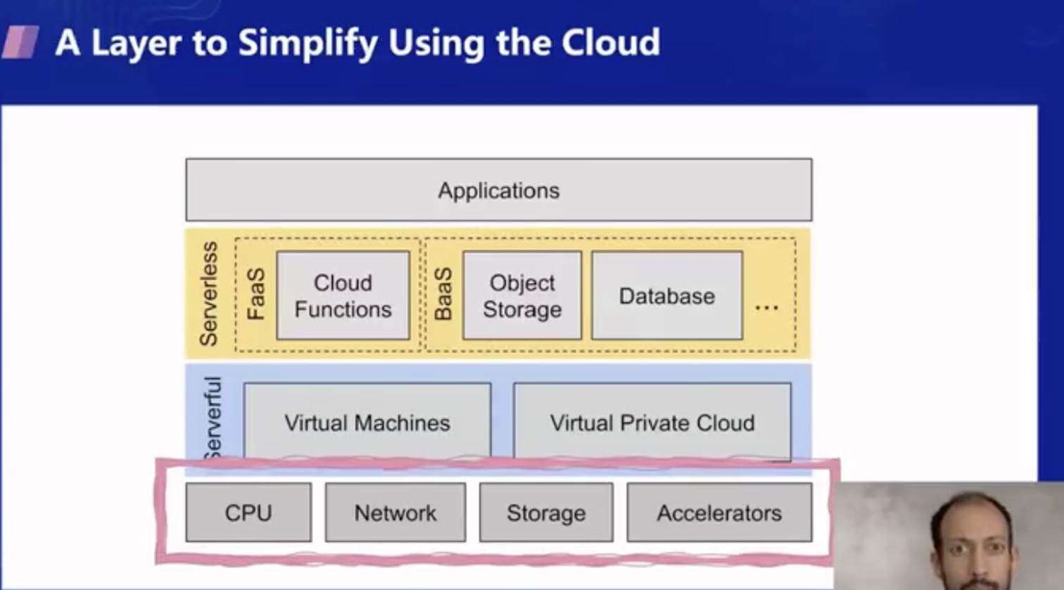 可以认为 Serverless Computing 是一种用云的简化方式。我们可以用下面这张图来说明。从最底下开始,在最底层你需要硬件,要有 CPU,网络,存储,和一些加速器(如 GPU 或者机器学习的加速器),在这之上云通过虚拟化技术提供了抽象层,硬件服务器被分隔成了多个互相隔离的虚拟机/虚拟私有网络,这一层的服务形态和底层架构是类似的,对于应用层面来说使用起来也有一些复杂,所以出现了 Serverless 的概念,在这一层中 Serverless 化的服务让调用基础设施变得更加简单。