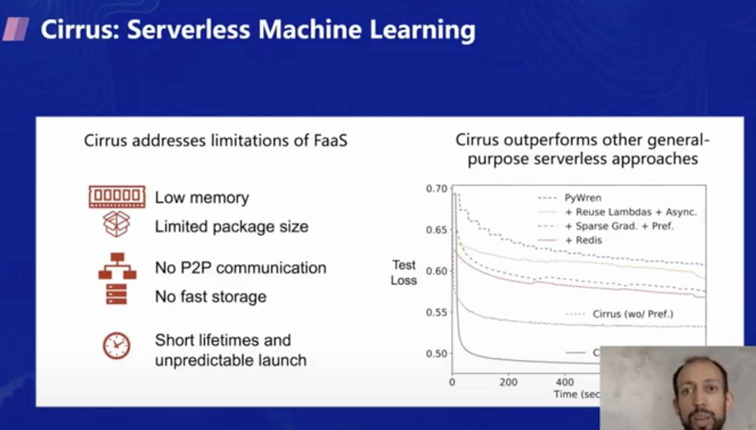 但是根据右边的实验结果可以看出,在越短的执行时间内,Cirrus 的性能表现越好,甚至优于其他几种机器学习技术。因此你可以根据自己的训练模型和需求选择要不要使用 Cirrus 作为 Serverless 机器学习的训练方案。
