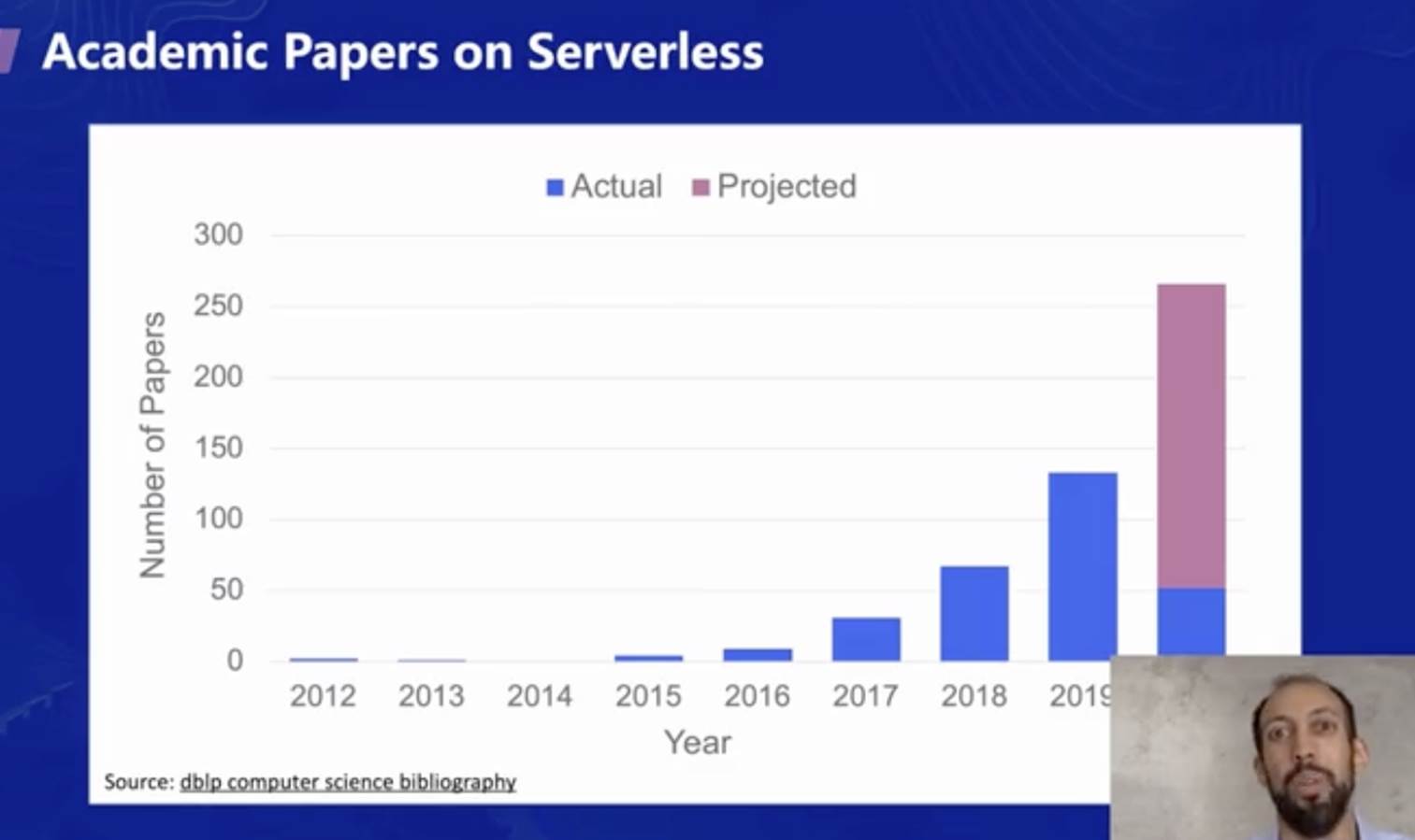 当新的技术趋势出现时,学术界往往非常活跃,从近几年的对 Serverless 方向研究的论文数就可以看出。如下图所示,最近几年来,Serverless 方向的论文数每年都在翻倍增长,在 2020 年,已发表+计划发表的论文将继续翻倍,达到近 300 篇。