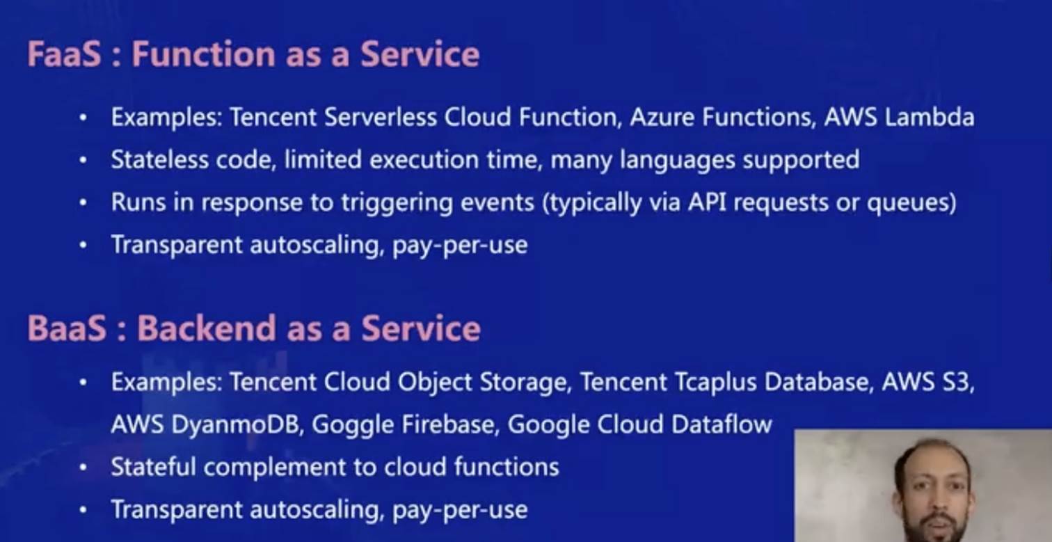 那么对于 Backend as a Service 后端即服务,相信大家也都听说过,但并不了解 BaaS 的准确含义。其中的一个重要原因是,BaaS 这个词对于不同的人来说含义也不同,对我们来说,BaaS 是和 FaaS 相对应的概念,其中“即服务”指的是不以“服务器”的方式来提供服务。例如腾讯云的 COS 对象存储服务,AWS DynamoDB 等,都算做是后端即服务。
