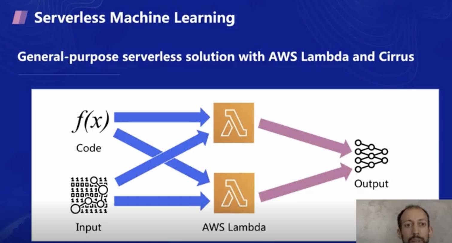 那么是否可以推出更加通用的机器学习解决方案呢?例如把数据或者代码作为函数的输入,并将其运行在 AWS Lambda 函数服务及 Cirrus 上进行机器学习训练。因此团队开发了 Cirrus 的机器学习库,可以让用户方便的在 Lambda 上端到端地进行机器学习训练,满足定制化需求。