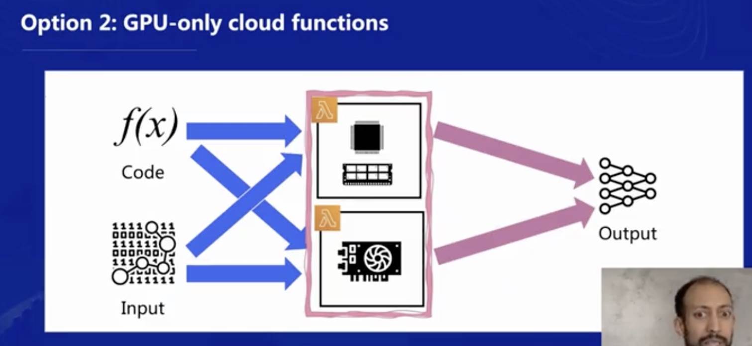 下图可以进一步解释这个理念,一种方式是在函数平台中同时提供 CPU 和 GPU 的支持,即每个函数的底层架构中既有 CPU、内存卡,也有 GPU 加速器。