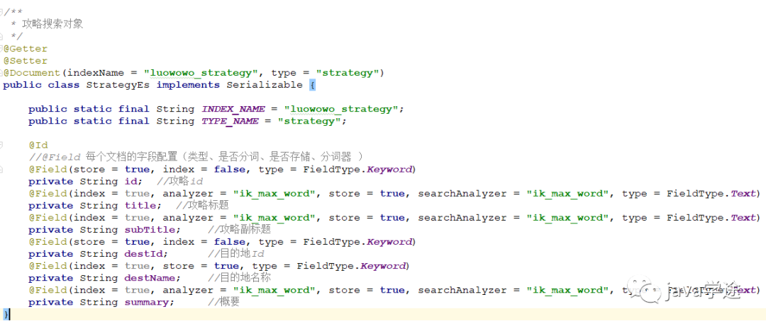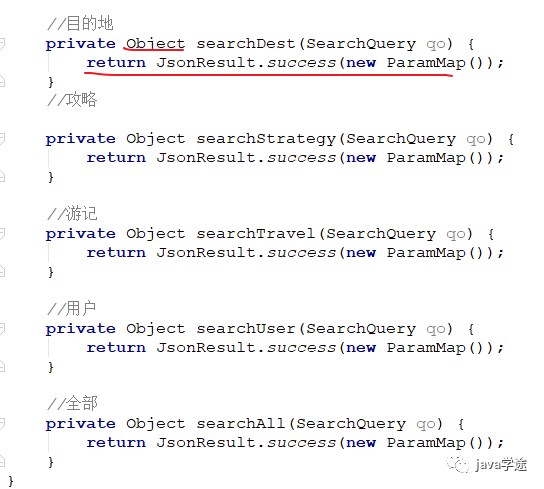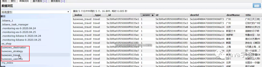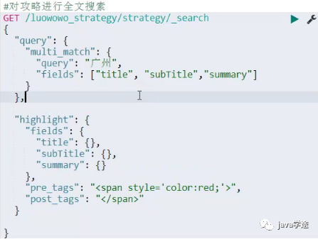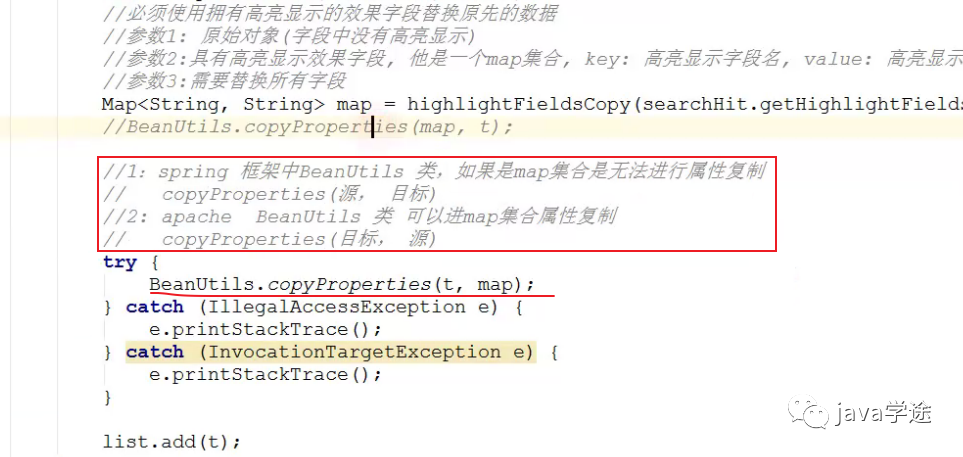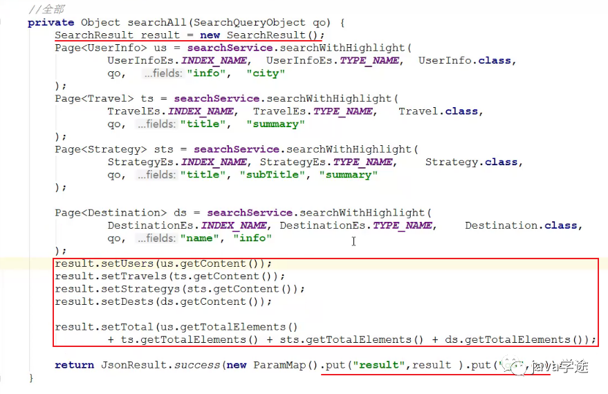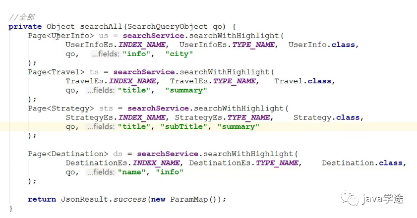 public class SearchServiceImpl implements ISearchService {private IUserInfoService userInfoService;private IStrategyService strategyService;private ITravelService travelService;private IDestinationService destinationService;private ElasticsearchTemplate template;//类比:select * from xxx where title like %#{keyword}% or subTitle like %#{keyword}% or summary like %#{keyword}%//关键字: keyword = 广州//以title为例://原始匹配: "有娃必看,广州长隆野生动物园全攻略"//高亮显示后:"有娃必看,<span style="color:red;">广州</span>长隆野生动物园全攻略"public <T> Page<T> searchWithHighlight(String index, String type, Class<T> clz, SearchQuery qo, String... fields) {String preTags = "<span style='color:red;'>";String postTags = "</span>";//需要进行高亮显示的字段对象, 他是一个数组, 个数由搜索的字段个数决定: fields 个数决定//fields : title subTitle summaryHighlightBuilder.Field[] fs = new HighlightBuilder.Field[fields.length];for (int i = 0; i < fs.length; i++) {//最终查询结果: <span style="color:red;">广州</span>fs[i] = new HighlightBuilder.Field(fields[i]).preTags(preTags) //拼接高亮显示关键字的开始的样式 <span style="color:red;">.postTags(postTags);//拼接高亮显示关键字的结束的样式 </span>}NativeSearchQueryBuilder searchQuery = new NativeSearchQueryBuilder();searchQuery.withIndices(index) //设置搜索索引.withTypes(type); // 设置搜索类型/*"query":{"multi_match": {"query": "广州","fields": ["title","subTitle","summary"]}},*/searchQuery.withQuery(QueryBuilders.multiMatchQuery(qo.getKeyword(), fields)); //拼接查询条件/**"from": 0,"size":3,*/searchQuery.withPageable(qo.getPageable()); //分页操作//高亮显示/**"highlight": {"fields" : {"title" : {},"subTitle" : {},"summary" : {}}}*/searchQuery.withHighlightFields(fs);//List<UserInfoEs> es = template.queryForList(searchQuery.build(), UserInfoEs.class);//调用template.queryForPage 实现结果处理//参数1:DSL语句封装对象//参数2:返回Page对象中list的泛型//参数3:SearchResultMapper 全文搜索返回的结果处理对象// 功能: 将DSL语句执行结果处理成Page 分页对象return template.queryForPage(searchQuery.build(), clz, new SearchResultMapper() {///mapResults 真正处理DSL语句返回结果 方法//参数1: DSL语句查询结果//参数2: 最终处理完之后, 返回Page对象中list的泛型//参数3: 分页对象public <T> AggregatedPage<T> mapResults(SearchResponse response, Class<T> clazz, Pageable pageable) {List<T> list = new ArrayList<>();SearchHits hits = response.getHits(); //结果对象中hist 里面包含全文搜索结果集SearchHit[] searchHits = hits.getHits();//结果对象中hist的hit 里面包含全文搜索结果集for (SearchHit searchHit : searchHits) {T t = mapSearchHit(searchHit, clazz);//必须使用拥有高亮显示的效果字段替换原先的数据//参数1: 原始对象(字段中没有高亮显示)//参数2:具有高亮显示效果字段, 他是一个map集合, key: 高亮显示字段名, value: 高亮显示字段值对象//参数3:需要替换所有字段Map<String, String> map = highlightFieldsCopy(searchHit.getHighlightFields(), fields);//BeanUtils.copyProperties(map, t);/*两个不同包下BeanUtils工具类的区别:1.springboot 框架中的BeanUtils类,如果参数是map集合,将无法进行属性的复制copyProperties(源, 目标);2.Apache 的BeanUtils类,可以对map进行属性的复制copyProperties(目标, 源);*/try {BeanUtils.copyProperties(t, map);} catch (IllegalAccessException e) {e.printStackTrace();} catch (InvocationTargetException e) {e.printStackTrace();}list.add(t);}//将结果集封装成分页对象Page : 参数1:查询数据, 参数2:分页数据, 参数3:查询到总记录数AggregatedPage<T> result = new AggregatedPageImpl<>(list, pageable, response.getHits().getTotalHits());return result;}public <T> T mapSearchHit(SearchHit searchHit, Class<T> clz) {String id = searchHit.getSourceAsMap().get("id").toString();T t = null;if (clz == UserInfo.class) {t = (T) userInfoService.get(id);} else if (clz == Travel.class) {t = (T) travelService.get(id);} else if (clz == Strategy.class) {t = (T) strategyService.get(id);} else if (clz == Destination.class) {t = (T) destinationService.get(id);} else {t = null;}return t;}});}//fields: title subTitle summaryprivate Map<String, String> highlightFieldsCopy(Map<String, HighlightField> map, String... fields) {Map<String, String> mm = new HashMap<>();//title: "<em>广州</em>小吃名店红黑榜:你还是当年珠江畔那个老字号吗?"//subTitle: "<em>广州</em>小吃名店红黑榜"//summary: "企鹅吃喝指南|“城市指南“第4站-<em>广州</em> 小吃篇"//title subTitle summaryfor (String field : fields) {HighlightField hf = map.get(field);if (hf != null) {//获取高亮显示字段值, 因为是一个数组, 所有使用string拼接Text[] fragments = hf.fragments();String str = "";for (Text text : fragments) {str += text;}mm.put(field, str); //使用map对象将所有能替换字段先缓存, 后续统一替换//BeanUtils.setProperty(t,field, str); 识别一个替换一个}}return mm;}}