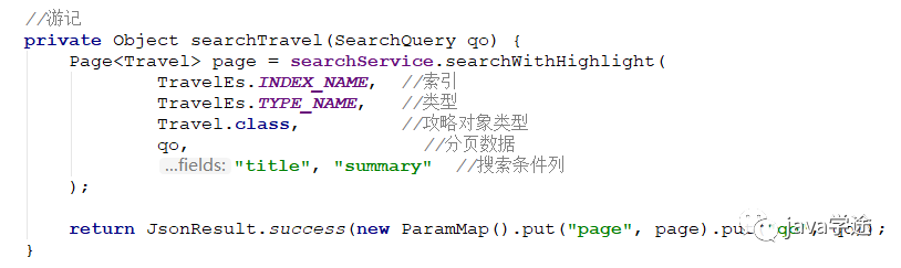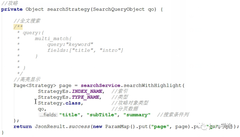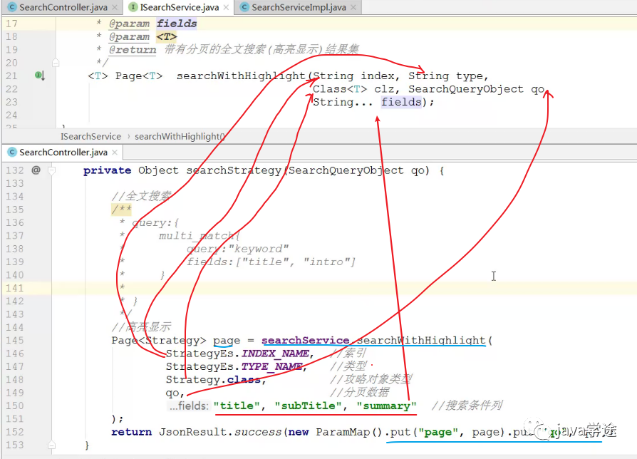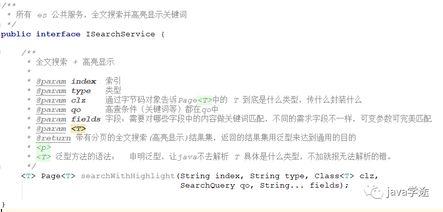 /*** 所有 es 公共服务,全文搜索并高亮显示关键词*/public interface ISearchService {/*** 全文搜索 + 高亮显示** @param index 索引* @param type 类型* @param clz 通过字节码对象告诉Page<T>中的 T 到底是什么类型,传什么封装什么* @param qo 高查条件(关键词等)都在qo中* @param fields 字段:需要对哪些字段中的内容做关键词匹配,不同的需求字段不一样,可变参数可完美匹配* @param <T>* @return 带有分页的全文搜索(高亮显示)结果集,返回的结果集用泛型来达到通用的目的* <p>* <T> 泛型方法的语法:申明泛型,让java不去解析 T 具体是什么类型,不加就报无法解析的错。*/<T> Page<T> searchWithHighlight(String index, String type, Class<T> clz,SearchQueryObject qo, String... fields);}