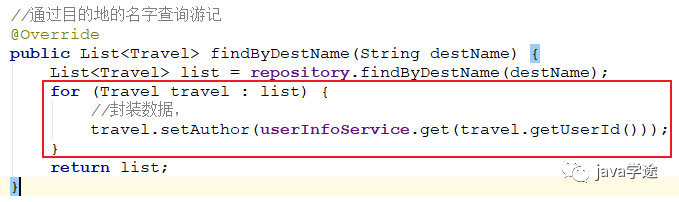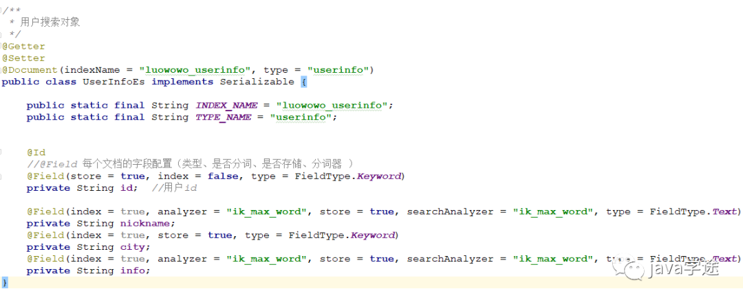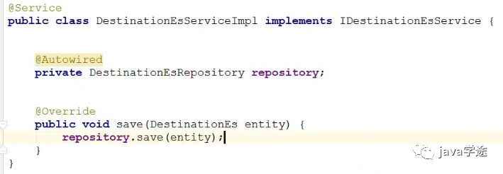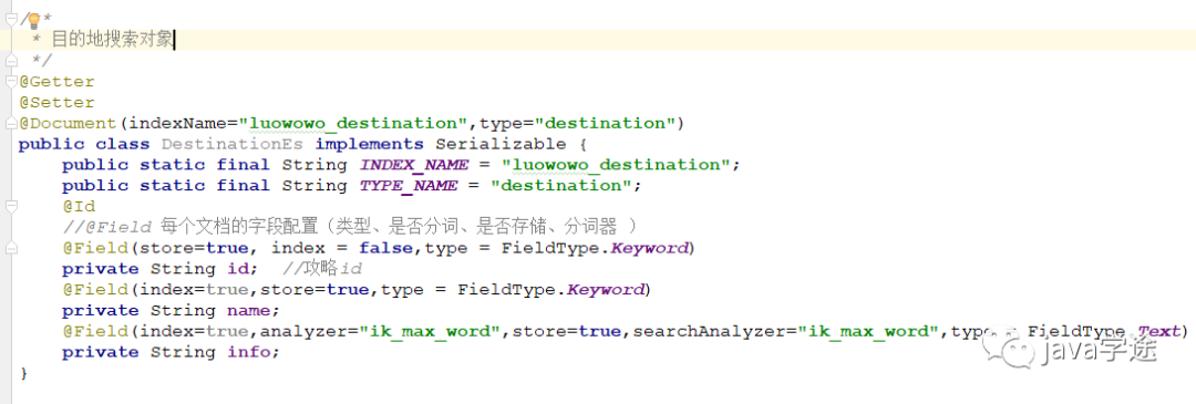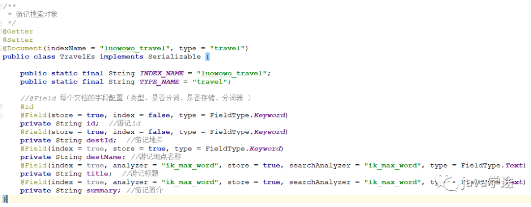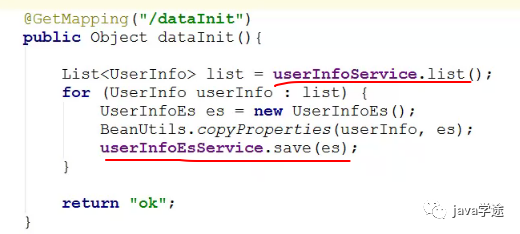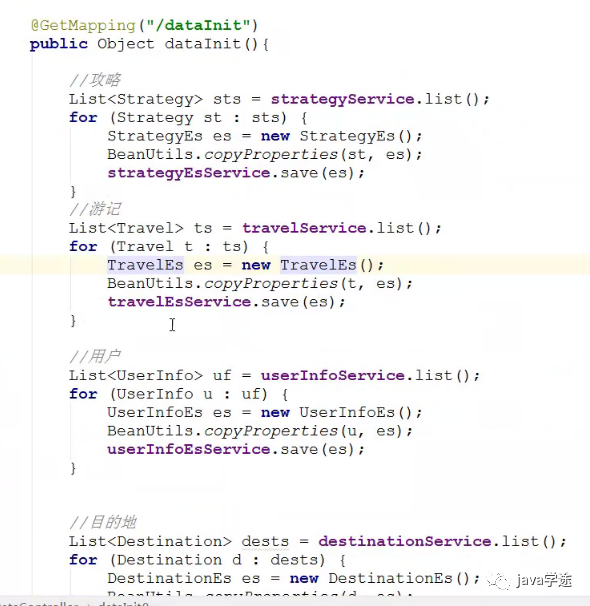 public class DataController {//es相关服务private IDestinationEsService destinationEsService;private IStrategyEsService strategyEsService;private ITravelEsService travelEsService;private IUserInfoEsService userInfoEsService;//mongodb相关服务private IDestinationService destinationService;private IStrategyService strategyService;private ITravelService travelService;private IUserInfoService userInfoService;("/dataInit")public Object dataInit() {//攻略需要存到es中的数据初始化List<Strategy> sts = strategyService.list();for (Strategy st : sts) {StrategyEs es = new StrategyEs();BeanUtils.copyProperties(st, es);strategyEsService.save(es);}//游记需要存到es中的数据初始化List<Travel> ts = travelService.list();for (Travel t : ts) {TravelEs es = new TravelEs();BeanUtils.copyProperties(t, es);travelEsService.save(es);}//用户需要存到es中的数据初始化List<UserInfo> uf = userInfoService.list();for (UserInfo u : uf) {UserInfoEs es = new UserInfoEs();BeanUtils.copyProperties(u, es);userInfoEsService.save(es);}//目的地需要存到es中的数据初始化List<Destination> dests = destinationService.list();for (Destination d : dests) {DestinationEs es = new DestinationEs();BeanUtils.copyProperties(d, es);destinationEsService.save(es);}return "ok";}}