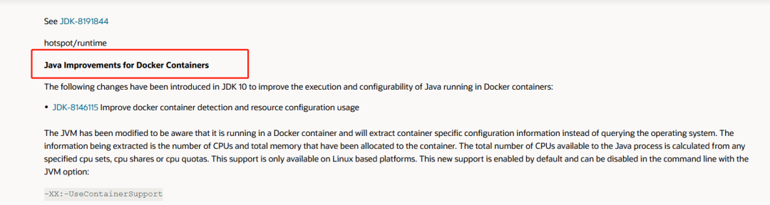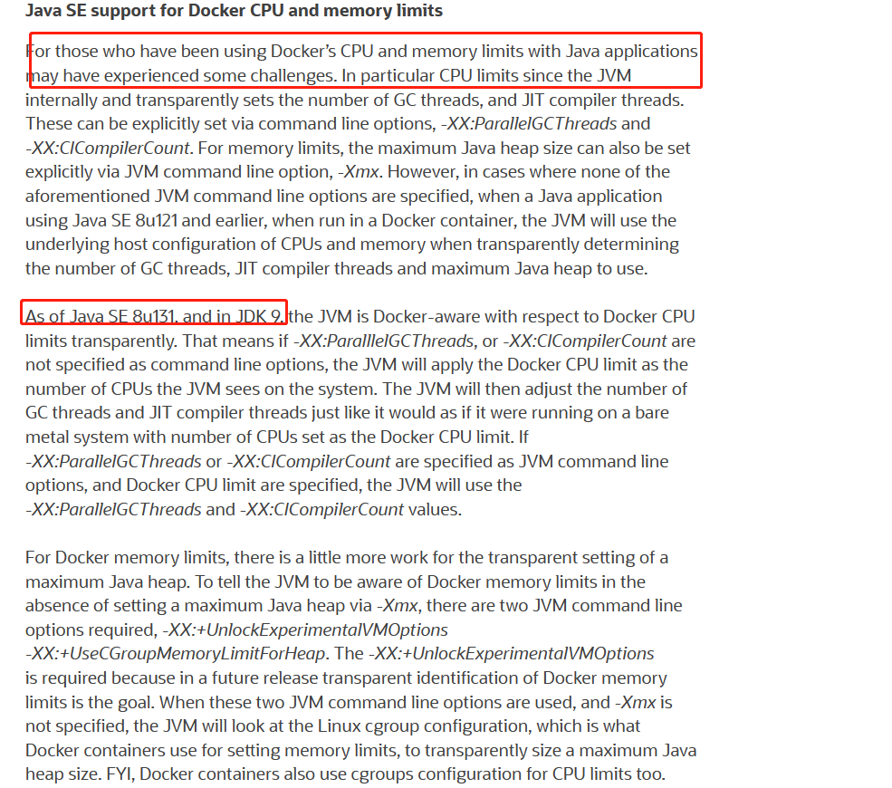 于是在网上找到了如下信息,大概意思是说,jdk从131版本之后开始通过选项支持对容器对内存和CPU 的限制,如下图所示: