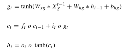 因此,作者这里通过了一个短期时态模块和一个长期时态模块来对时间依赖性进行建模。其中,短期时态模块如前面的模型整体图中所示,是由卷积LSTM来捕捉短期时间依赖,卷积LSTM的公式如下: