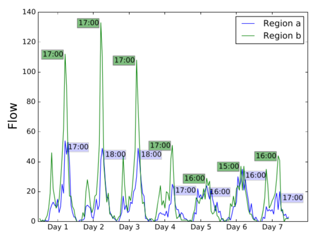 考虑长时间周期下伴随形态偏移的问题会更加复杂,而交通序列数据由于不具有严格的周期性,所以而该问题在此类型数据中普遍存在。现有的工作已经考虑了时间转移采取了周期性注意机制。但是,它忽略了时间漂移随地区的不同而不同。如下图显示了NYC-Bike数据集上一周内两个不同区域的日峰值。