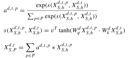 显然,交通序列的日高峰存在于一天的不同时间。此外,这两个区域的时间漂移也不同。因此,文章作者提出了一个区域层面的注意机制来处理长期时态模块中各区域的时间漂移。具体地,作者先是在数据的日周期下中选取了几个时间区间,以得到每个区间中的时序数据,并以这个区间前后相邻的区间作为其时序漂移特征。例如,预测的时间区间是10:00-11:am,则选取的时间区间是9:00-10:00am,10:00-11:am,11:00-12:am。进而,通过卷积LSTM来对每个区间漂移模式进行特征提取,之后采用区域级注意机制来处理长时间周期的时间漂移。与以前将所有区域的时间漂移考虑为相同的方法不同,LDRSN是在区域层次上学习的。公式定义为: