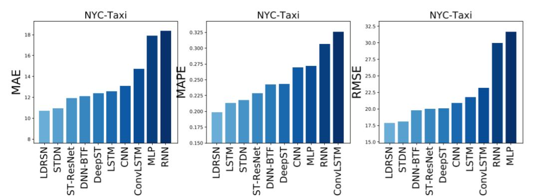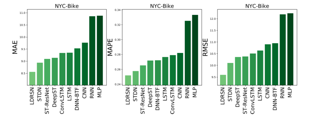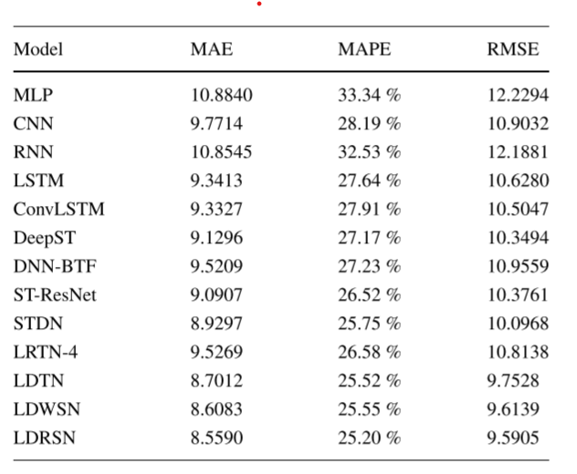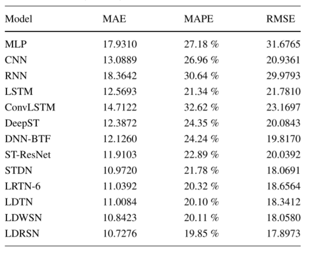 文中的实验部分用到了很多常用的深度学习方法进行对比,其对比的实验结果如下表所示,两个表格分别表示模型在两种数据集下的实验结果。可以看出作者提出的LDRSN实现了最小的MAE,MAPE以及RMSE指标。