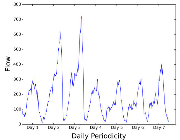 下图描述了纽约出租车数据集上每周所有时间间隔的人群流量。长期时间相关性的周期性可以很明显地观察到。例如,每天的高峰时间间隔是相似的。