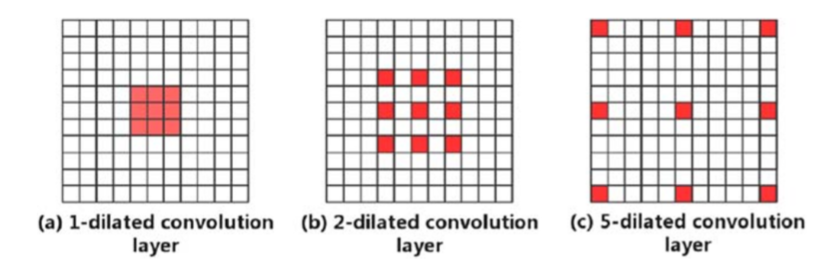 这里用到扩张卷积的好处是,例如我们使用局部卷积的话,通过5层卷积才能得到的相关性信息这里只需要通过5-dilated的扩张卷积就可以实现,具体如下图所示。因此,扩张卷积显然可以在不增加卷积层的情况下有效地捕捉到不同距离空间的依赖关系。