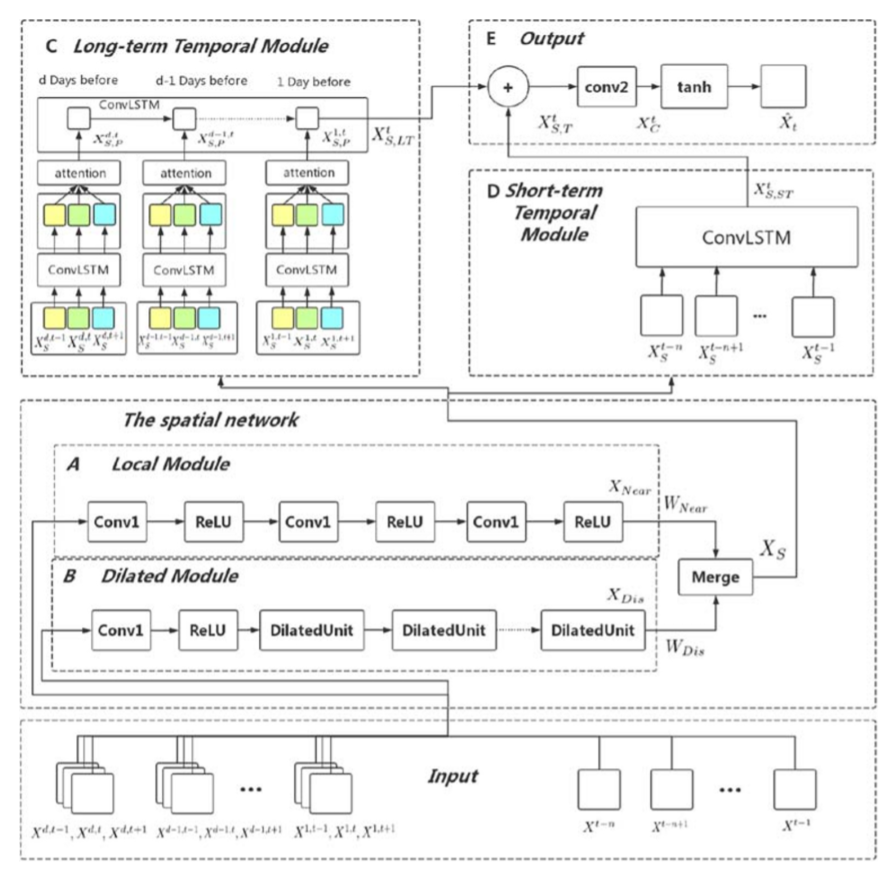 首先,整个城市作为一个图像,通过将交通数据的流入和流出整合到一个两通道图像矩阵中。然后将流矩阵分别输入到局部卷积模块和扩张卷积模块中,以建立近距空间依赖和远距空间依赖的模型,两个模块的合并结果作为数据的空间特征。进而,卷积LSTM被用于数据的短期和长期依赖关系。之后,一种区域注意机制用于在长期时间依赖中学习各个区域的时间特征变化。最后,两个时域模块的输出串联起来,再经过一个1×1的卷积层和tanh函数得到最终的预测。下面针对空间和时间的模块对模型的细节进行介绍: