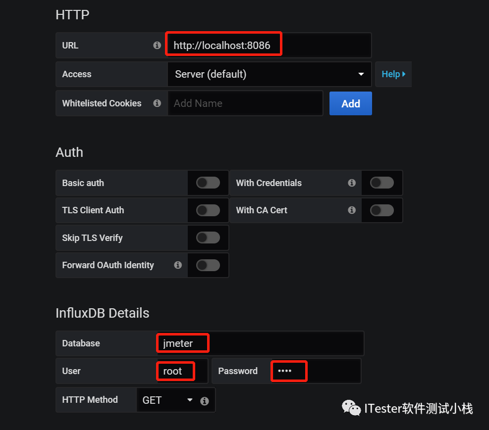 ③输入ip和端口,InfluxDB信息。如果没做更改的话,user和pwd都是默认的root, 为了安全起见,可以自行修改。