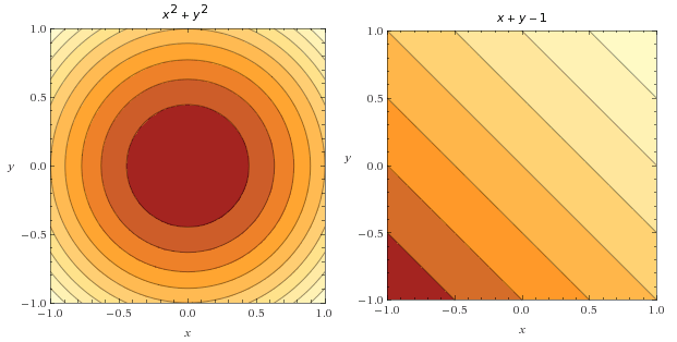可以看到,这个问题中,在可行集上只有在一个点处两个函数的梯度向量平行(指向相同方向),该点处的函数值正是在该约束下目标函数的最小值。