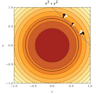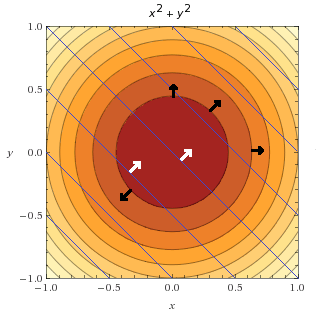 值得注意的是,可以在一个图上同时展示这两个等值线图来可视化这两个函数。下图中,可以看到由蓝色线条描述的约束函数。这里画了目标函数的几个梯度向量(黑色箭头)以及约束函数的两个梯度向量(白色箭头)加以对比。