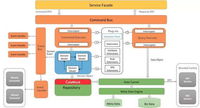 换一个视角,从 COLA 应用处理响应一个请求的过程来看。COLA 使用了 CQRS 来分离命令和查询的职责,使用扩展点和元数据来提升应用的扩展性。整个处理流程如下图所示: