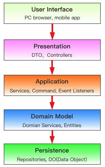 2)应用层(Application Layer):主要负责获取输入,组装上下文,做输入校验,调用领域层做业务处理,如果需要的话,发送消息通知。当然,层次是开放的,若有需要,应用层也可以直接访问基础实施层;