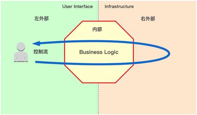 六边形架构又称为端口-适配器架构,这个名字更容易理解。六边形架构将系统分为内部(内部六边形)和外部,内部代表了应用的业务逻辑,外部代表应用的驱动逻辑、基础设施或其他应用。