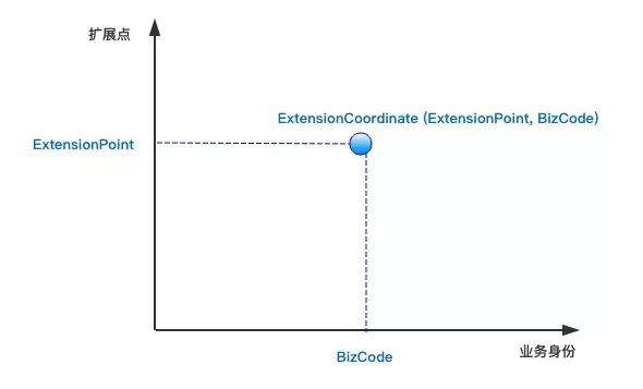 每个业务或者场景都可以实现一个或多个扩展点(ExtensionPoint),也就是说一个业务身份加上一个扩展点,可以唯一地确定一个扩展实现(Extension)。而这个业务身份和扩展点的组合,我们将其称之为扩展坐标(ExtensionCoordinate),如下图所示。
