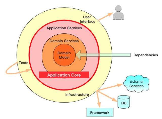 不同的是洋葱架构还告诉我们,企业应用中存在着不止两个层次,它在业务逻辑中加入了一些在领域驱动设计的过程中被识别出来的层次(Application,Domain Service,Domain model,Infrastructure等)。