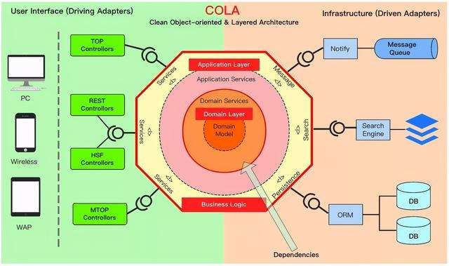 在架构思想上,COLA 主张像六边形架构那样,使用端口-适配器去解耦技术细节;主张像洋葱圈架构那样,以领域为核心,并通过依赖倒置反转领域层的依赖方向。最终形成如下图所示的组件关系。