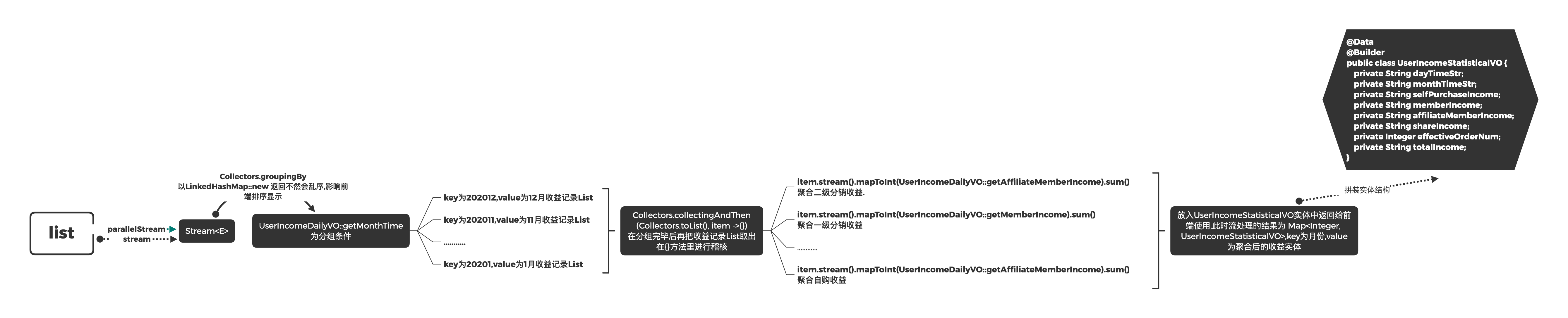 //运用了stream的聚合,以月份进行分组,分组后用LinkedHashMap接收防止分组后月份顺序错乱,完毕后再把得到的每个月的收益集合流进行聚合并组装成最终的实体返回