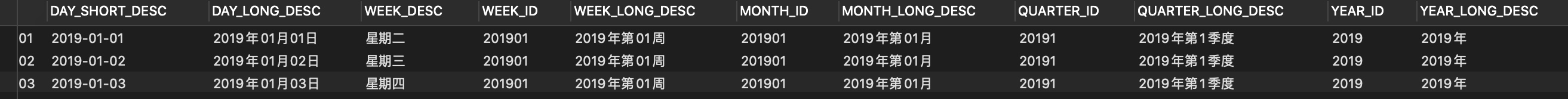 为了减少表的数据量,如果当日没有收益变动是不会创建当日的日统计数据的,所以这里只能查询出某时间区间用户有收益变动的收益统计数据.如果处理某一天数据为空的情况则还需要再程序中特殊处理.此处有小妙招,在数据库中生成一张时间辅助表.以天为单位,存放各种格式化后的时间数据,辅助查询详细操作可见这篇博文Mysql生成时间辅助表.有了这张表就可以进一步优化这条SQL.时间辅助表的格式如下,也可修改存储过程,加入自己个性化的时间格式.