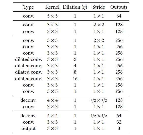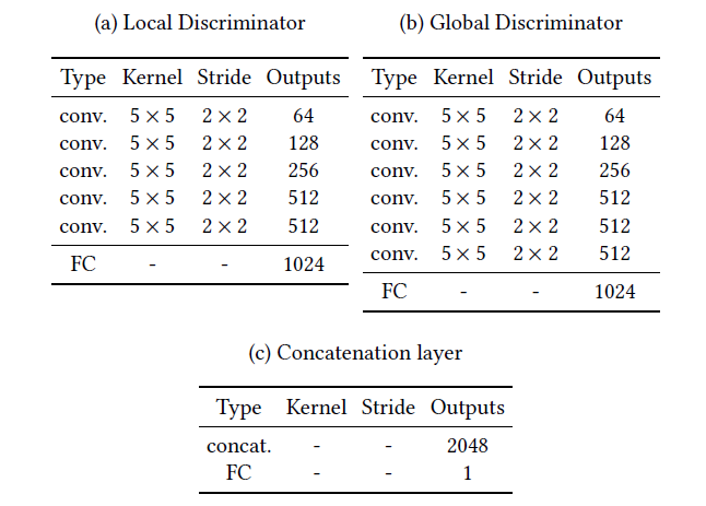 补全网络部分,作者采用12层卷积网络对输入图像进行encoding,得到一张原图16分之一大小的网格。然后再对该网格采用4层卷积网络进行decoding。为了保证生成区域尽量不模糊,文中降低分辨率的操作是使用strided convolution 的方式进行的,而且只用了两次,将图片的size 变为原来的四分之一。同时在中间层还使用了空洞卷积来增大感受野,在尽量获取更大范围内的图像信息的同时不损失额外的信息,从而得到复原图像。下表为补全网络各层参数分布情况。