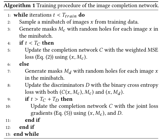 在此篇论文中,作者们提出了Globally and Locally Consistent Image Completion方法,可以使得图像的缺失部分自动补全,局部和整图保持一致。作者通过全卷积网络,可以补全图片中任何形状的缺失,为了保持补全后的图像与原图的一致性,作者使用全局(整张图片)和局部(缺失补全部分)两种鉴别器来训练。全局鉴别器查看整个图像以评估它是否作为整体是连贯的,而局部鉴别器仅查看以完成区域为中心的小区域来确保所生成的补丁的局部一致性。