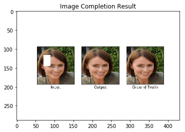 Image Completion Result 中的 Input 是挖洞后输入补全网络的图像,在 Output 看到, Input 图像上挖的洞已经被补上了,这说明现在的训练结果已经能在一定程度上补全图像的缺失部分了。由于本项目实现时在硬件及时间方面受限,因此对原文中的方法进行了简化,训练方法和数据样本处理较原论文有所调整做了调整,无法达到原论文效果,但相较于原作者两个月的训练时间对比,这样的训练方式也是可取的。