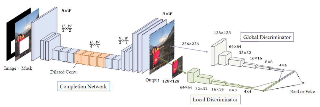 该论文的方法,完全以卷积网络作为基础,使用了GAN网络的思路,设计了两部分(三个网络),一部分用于生成图像,即补全网络,一部分用于鉴别生成图像是否与原图像一致,即全局鉴别器和局部鉴别器。网络结构图如下所示: