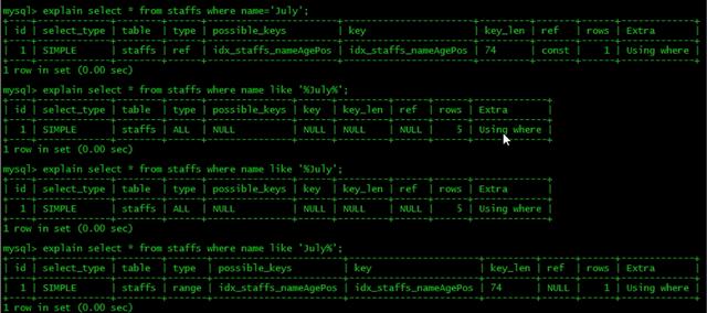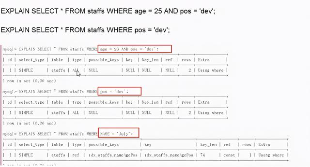 - order by 多个字段排序时,不是按照索引顺序进行 order by,即不是按照最左前缀法则,如:select a, b from staffs order by b asc, a asc;