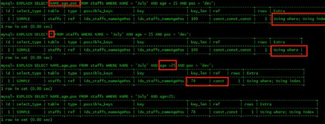 即:select 查询字段和 where 中使用的索引字段一致。