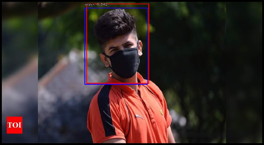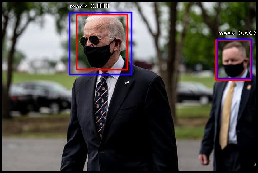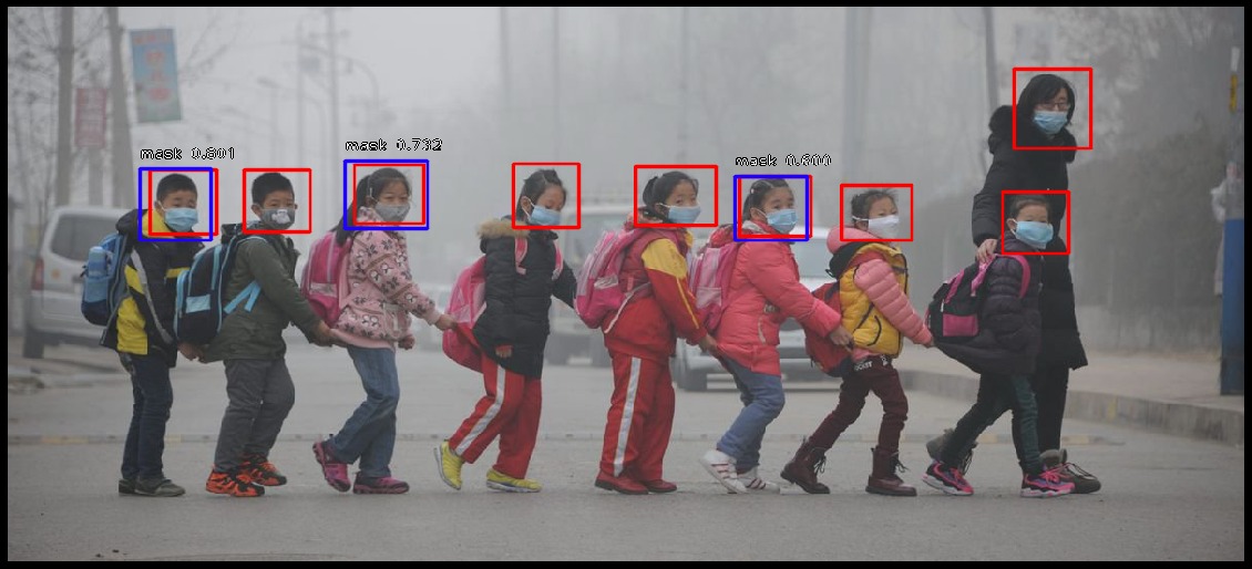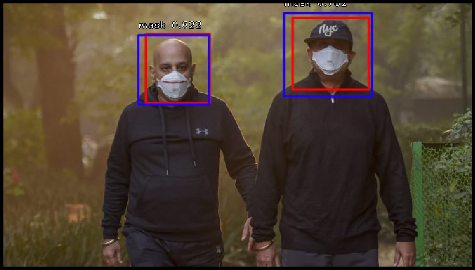 RetinaNet是一个功能强大的模型,使用Feature Pyramid Networks&ResNet作为其骨干。 我能够通过非常有限的数据集和极少的迭代(每个迭代有500个步长,共6次迭代)获得口罩检测器的良好结果。当然你也可以更改阈值。