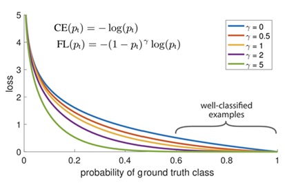 Focal loss γ平滑地调整了简单示例的权重。 随着γ的增加,调制因子的作用也同样增加。 (经过大量实验和试验,研究人员发现γ= 2最有效)
