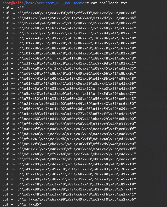 执行该命令后会在同目录下生成一个shellcode.txt,将生成的shellcode替换exp中的exploit.py中的USER_PAYLOAD保存即可。
