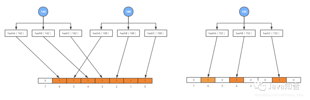 布隆过滤器通过使用多次的hash计算来进行数值是否存在的判断,虽然大大降低了hash冲突的情况,但是还是存在一定的缺陷,那就是容易会有误判的情况。例如说如下如所示: