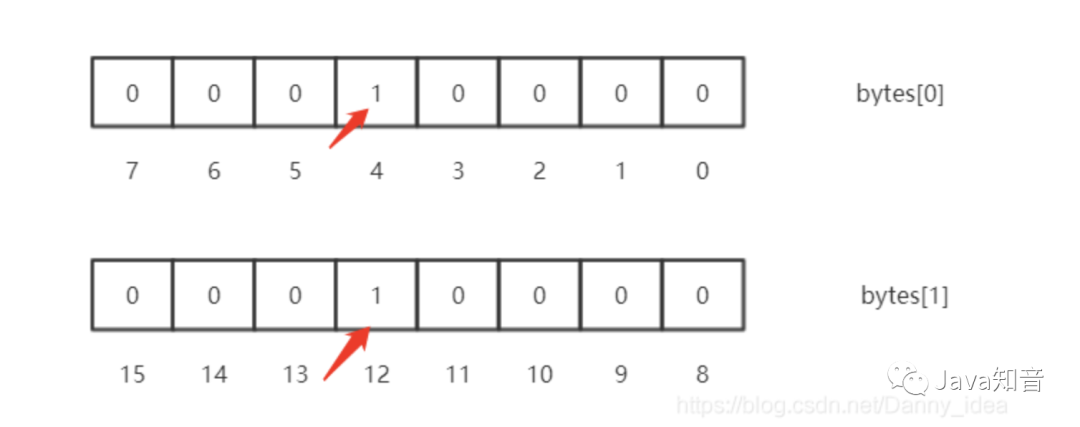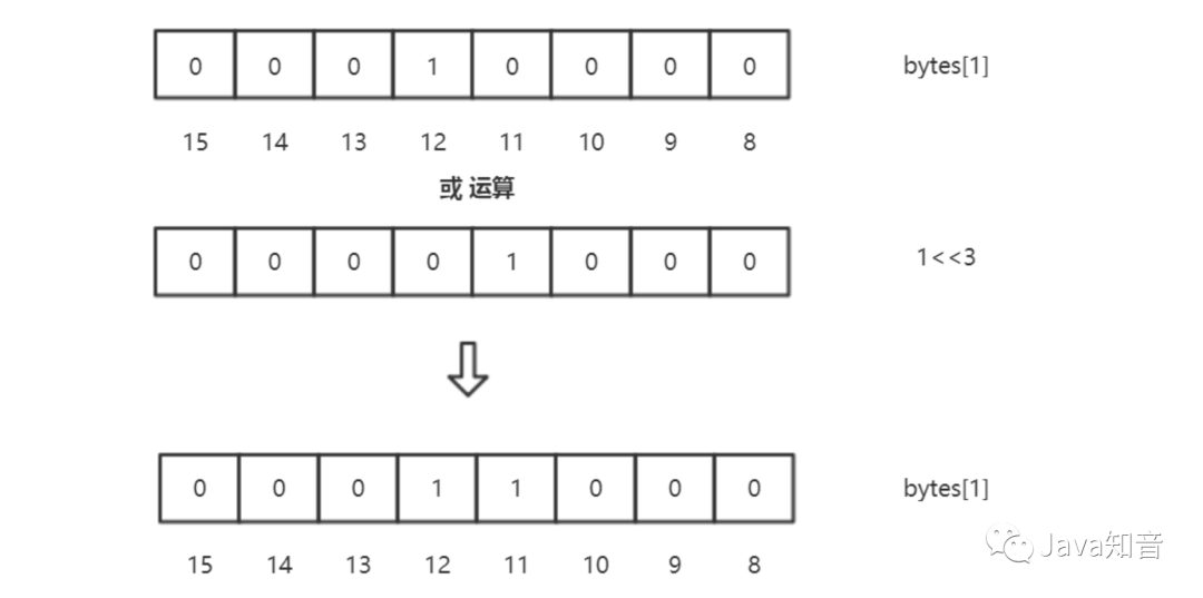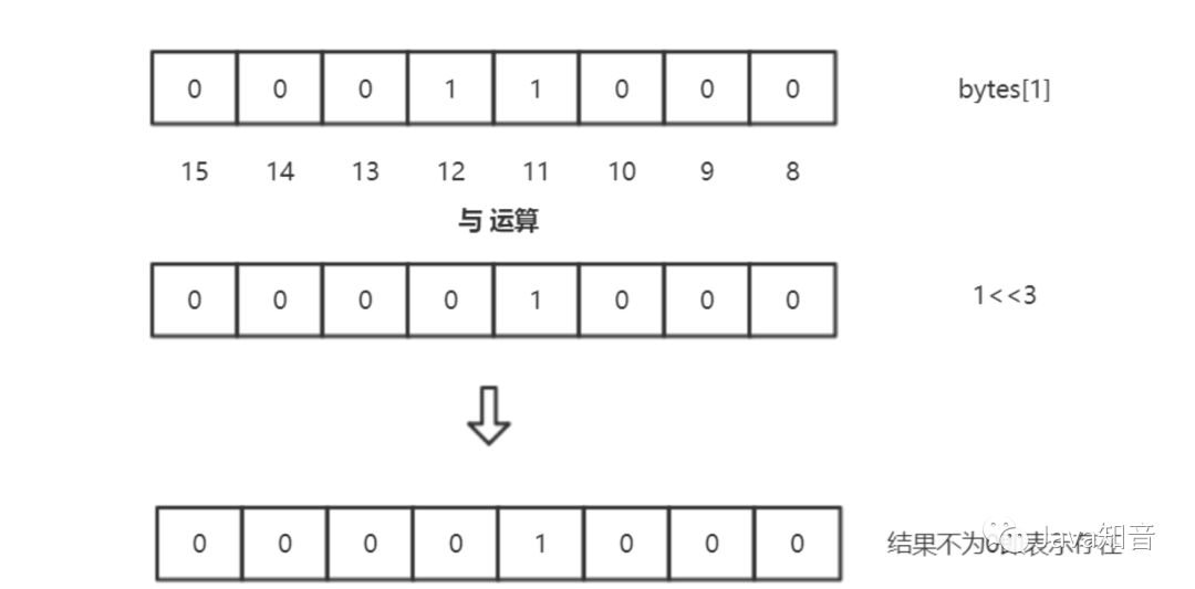 例如说往bitmap里面存储一个数字11,那么首先需要通过向右移位(因为一个byte相当于8个bit),计算出所存储的byte[]数组的索引定位,这里计算出index是1。由于一个byte里面存储了八个bit位,所以通过求余的运算来计算postion,算出来为3。