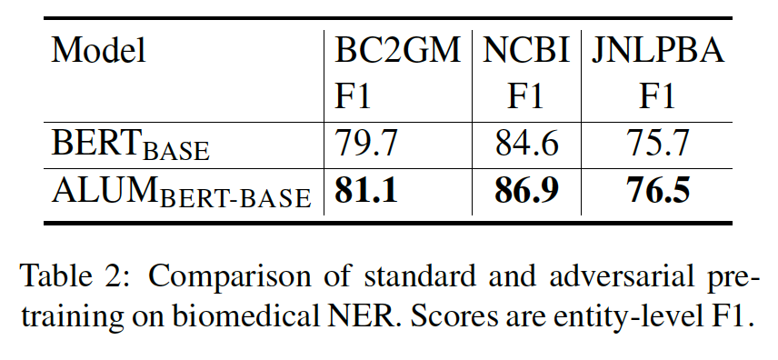 ALUM大大提高了BERT和RoBERTa在各种NLP任务中的准确性,并且可以与对抗微调相结合以获得进一步的收益。 -