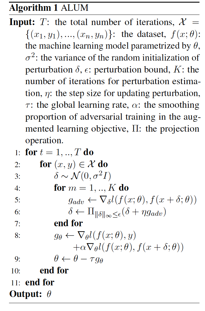 第4-6行为求最大梯度步骤,以找到使对抗性损失最大化的扰动(反局部平滑性)。K越大的近似值越高,但成本更高。为了在速度和性能之间取得良好的平衡,本文实验K=1.