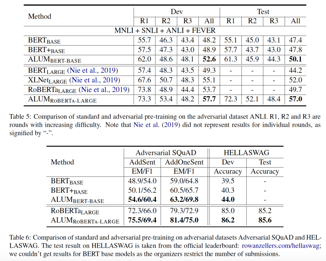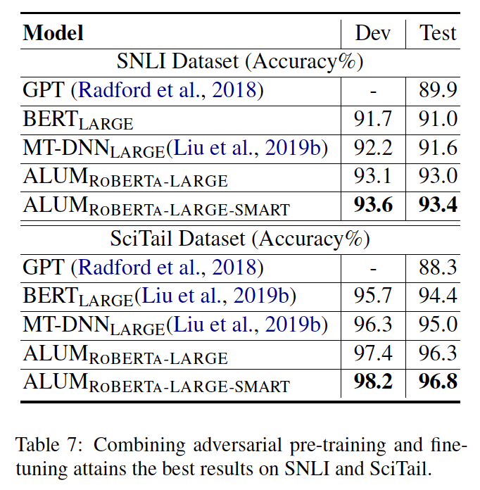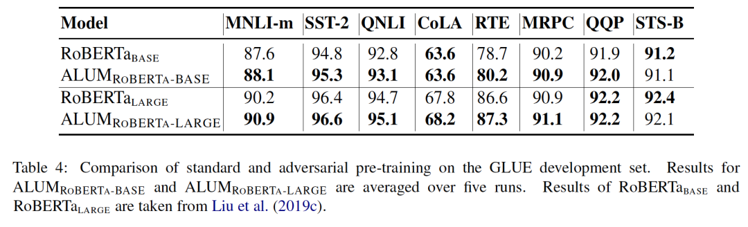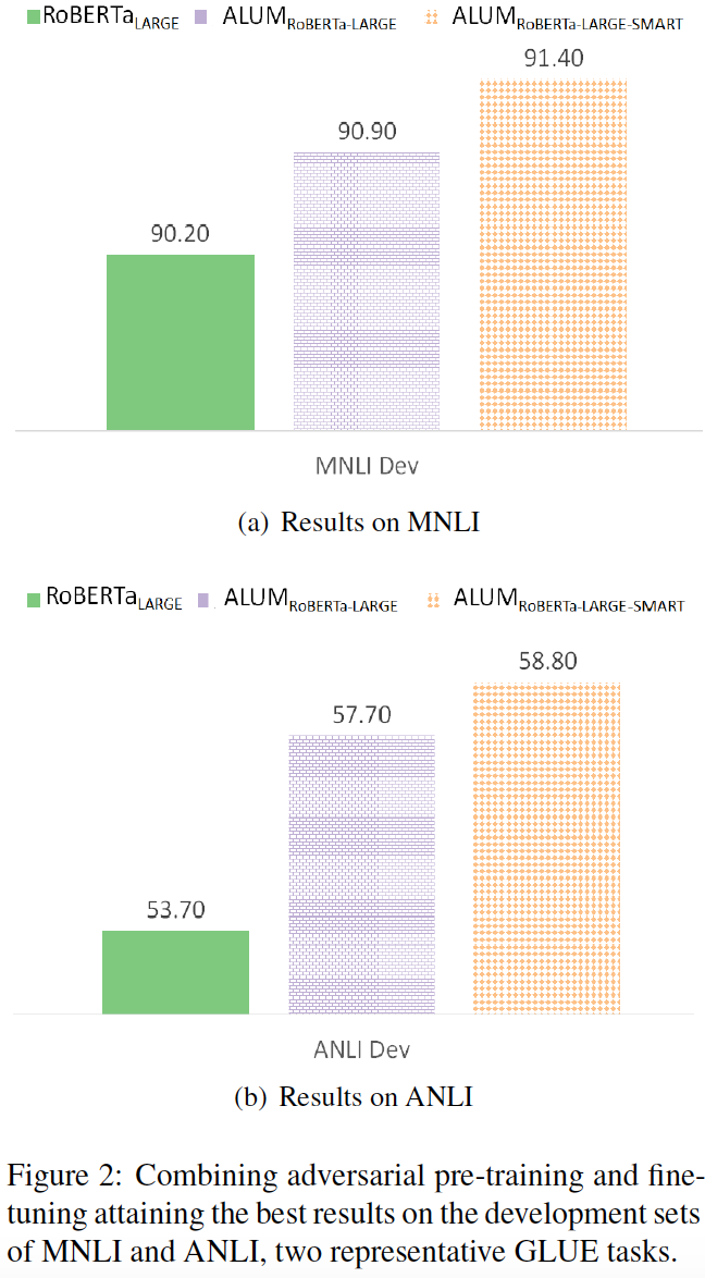 之前都是在预训练阶段做的对抗,ALUM RoBERTa-LARGE-SMART在预训练和微调阶段均做对抗。