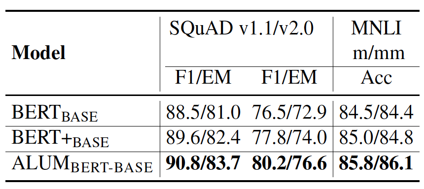 ALUM BERT-BASE是一个BERT模型,使用与BERT BASE相同的设置进行训练, 但最后的500K步骤使用ALUM。每一个对抗训练步骤大约比标准训练步骤 长1.5倍。